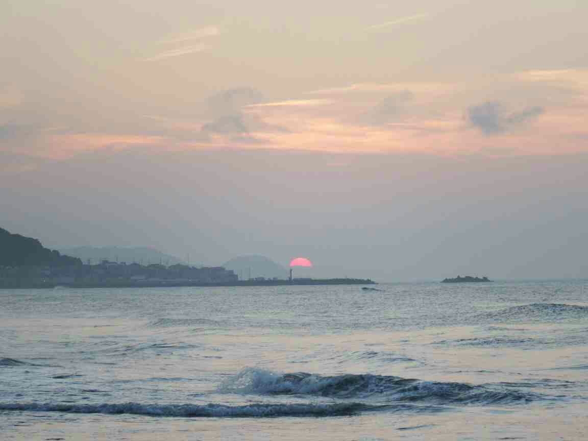 日の出前にサーフに下り、キャストを始めると綺麗な日の出「どうか釣れます様に」と心の中で手を合わす。