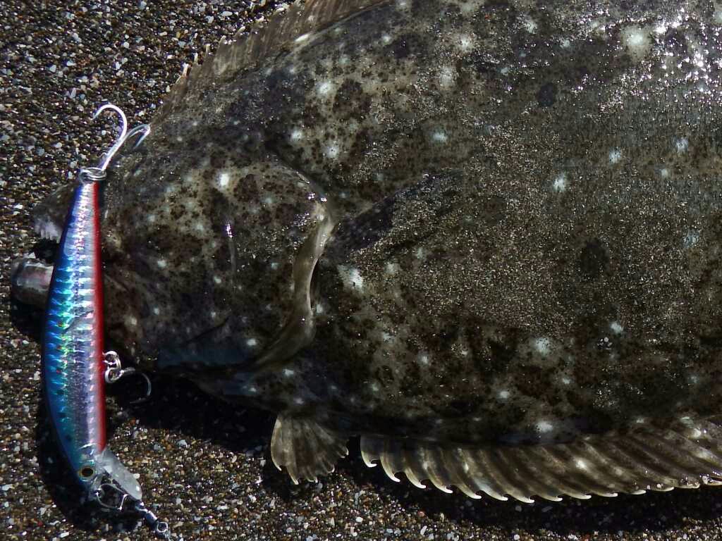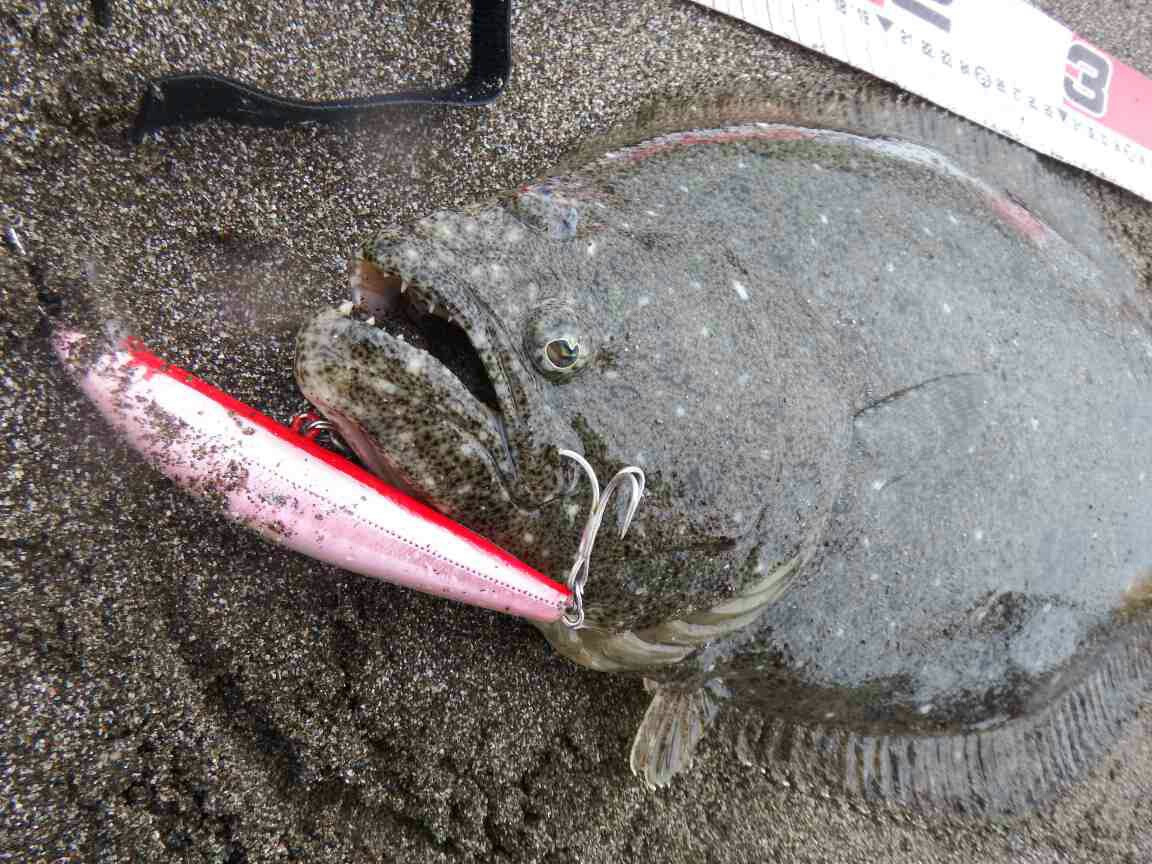 今度は十分な手応え、ハンドルを3,4回まわすと50cmクラスのヒラメが、ブレークに当たって出来た大きな波に持ち上げられ、魚体が見えた瞬間ロッドに掛かっていた負荷が消えた。