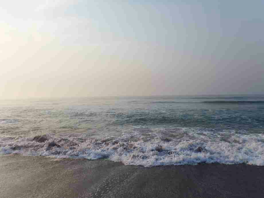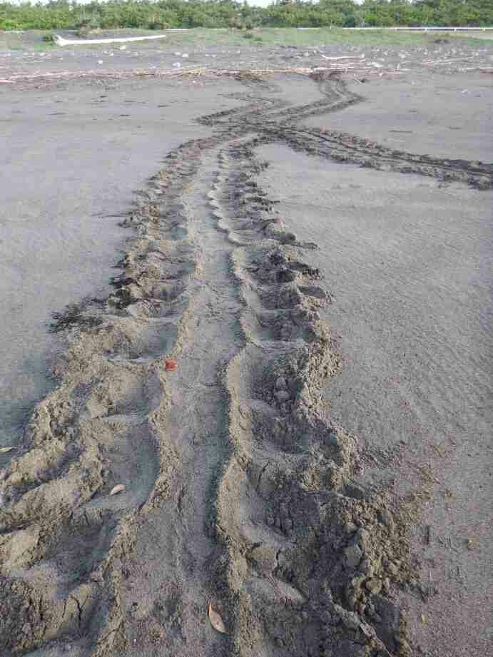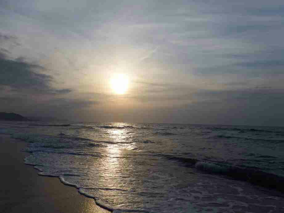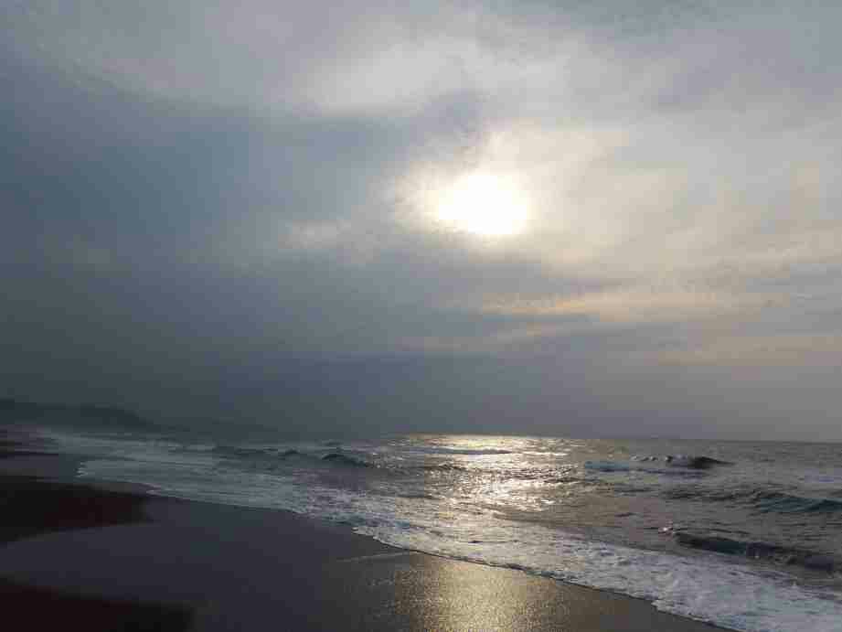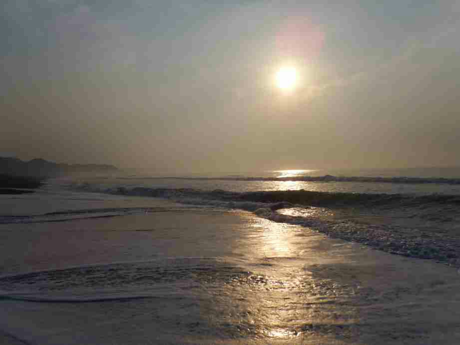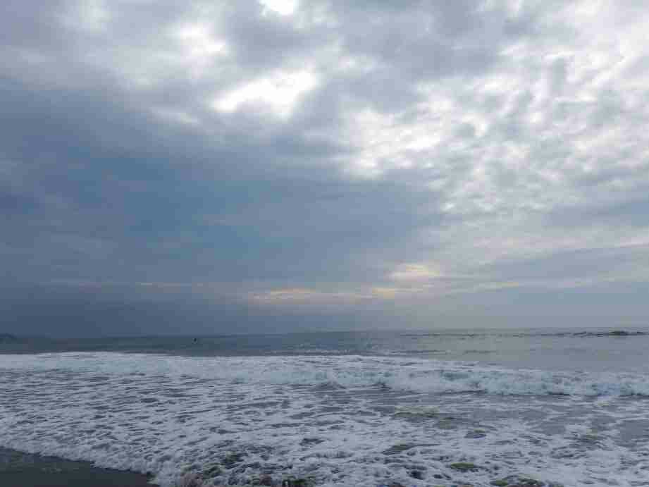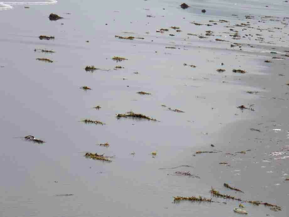 サーフに下りる前に高所で海の状態を注視しすると、時々大きな波は来るが水色は青々として良い、だが、砂浜には多くのゴミと海草が打ち上げられている。
