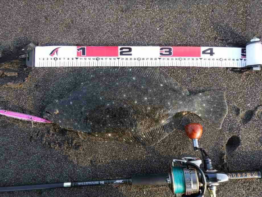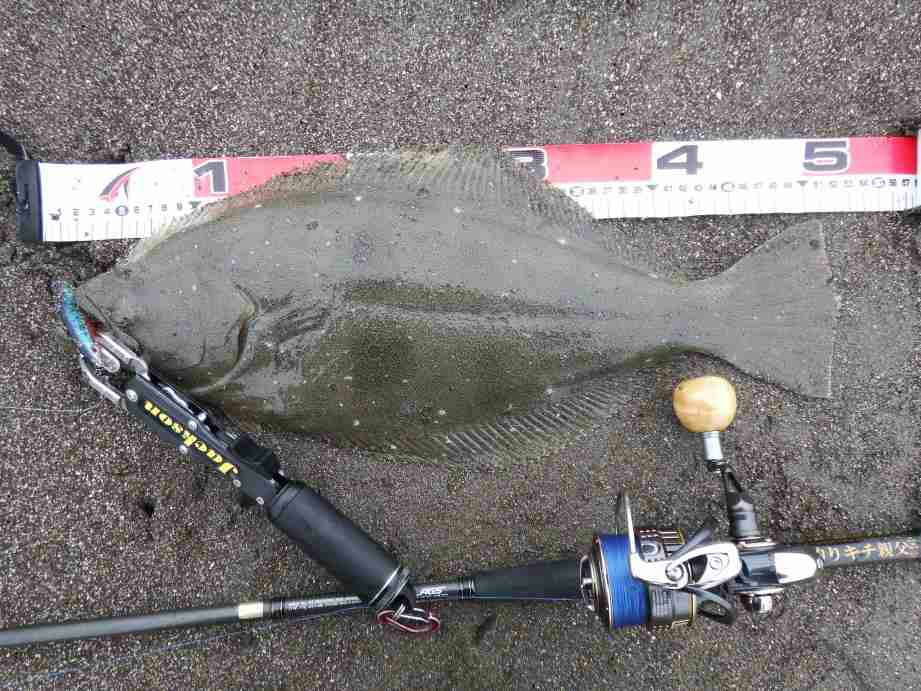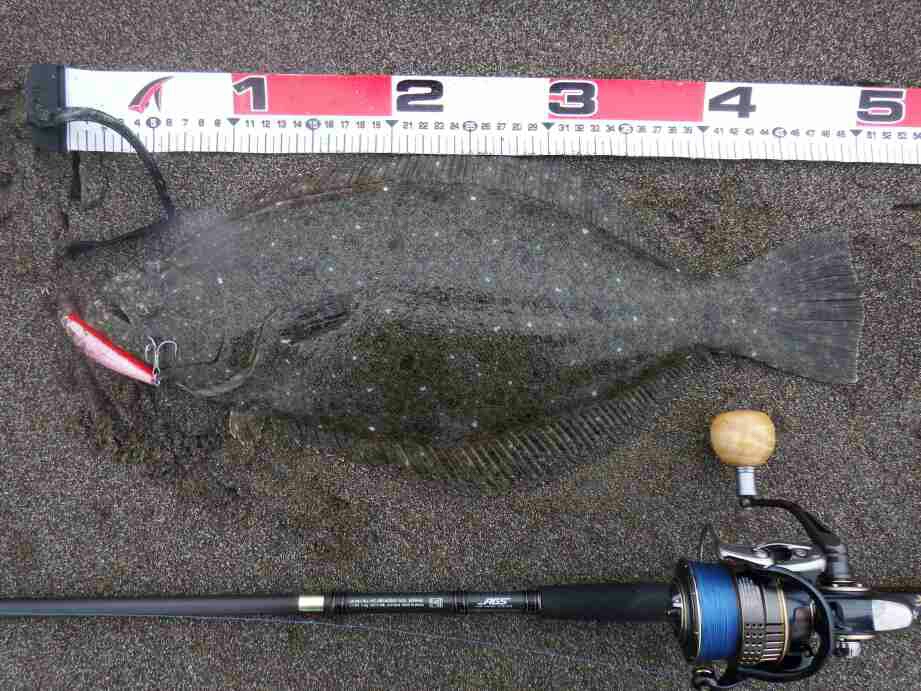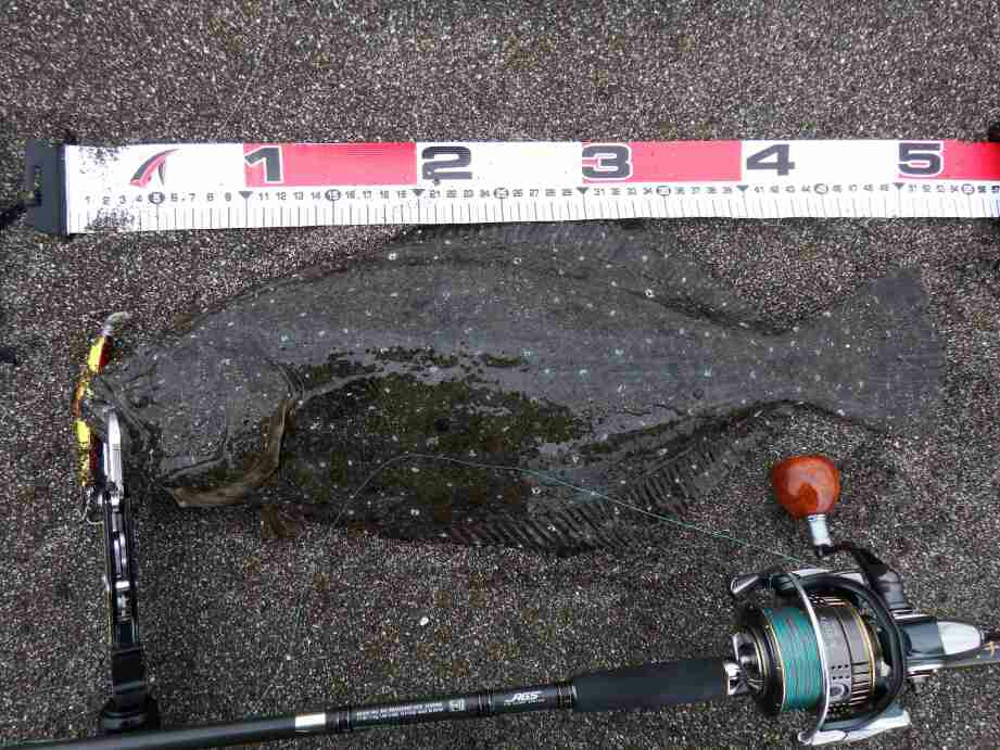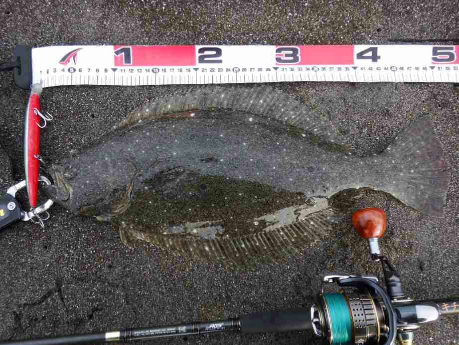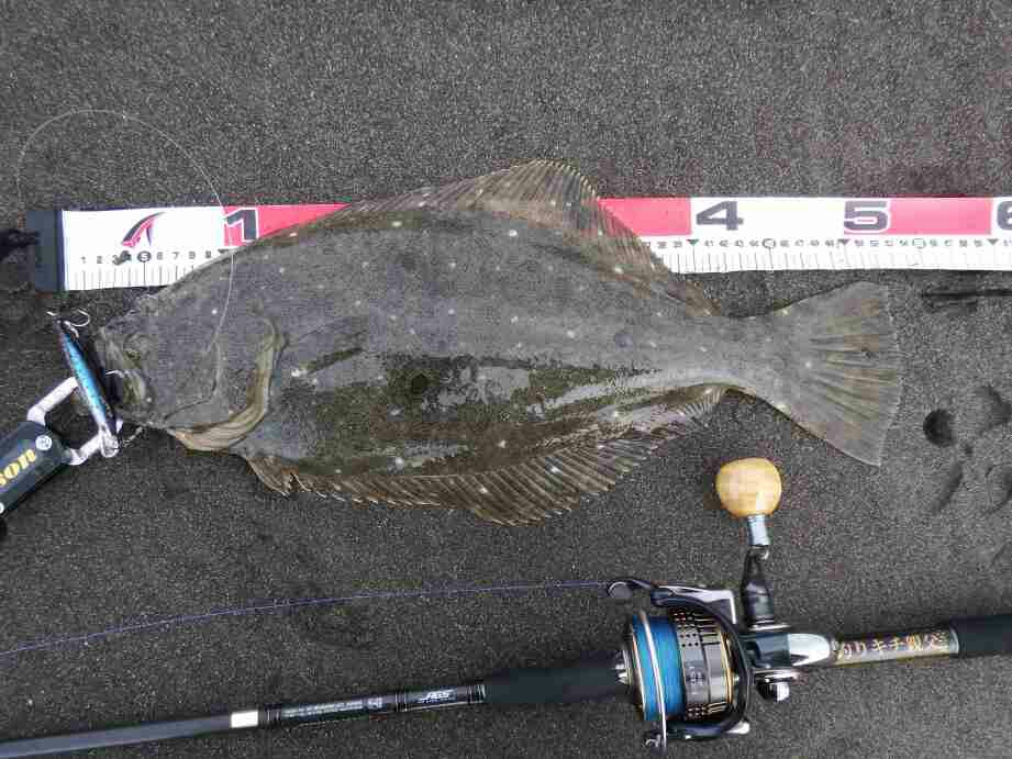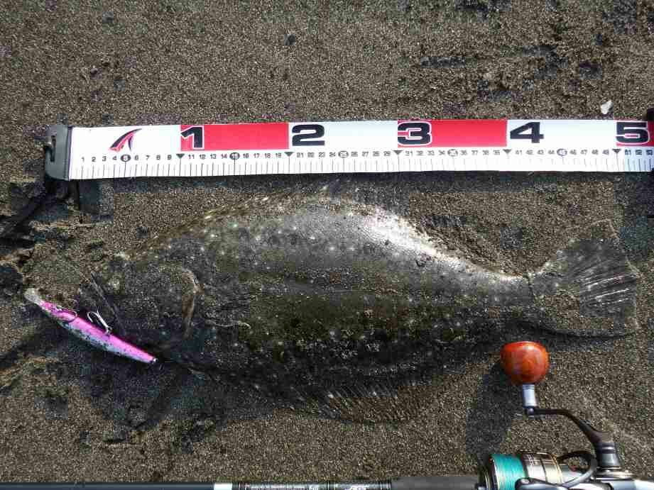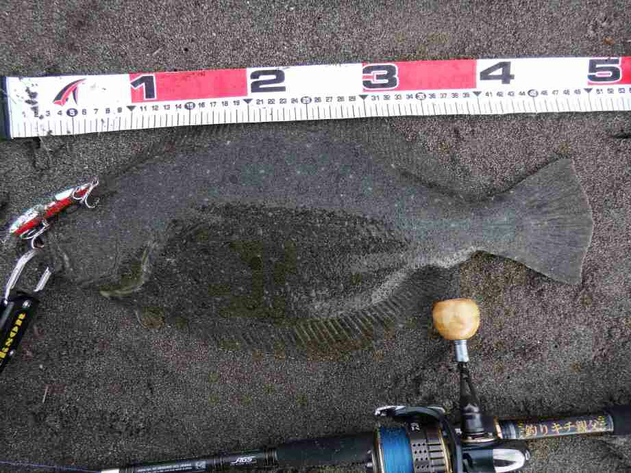 データー:06:10ゲット、ヒラメ体長52cm、ジャクソン アスリート14SS キビナゴ