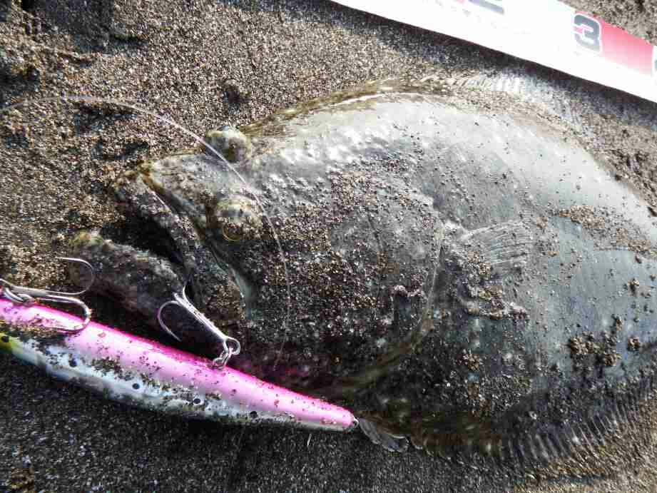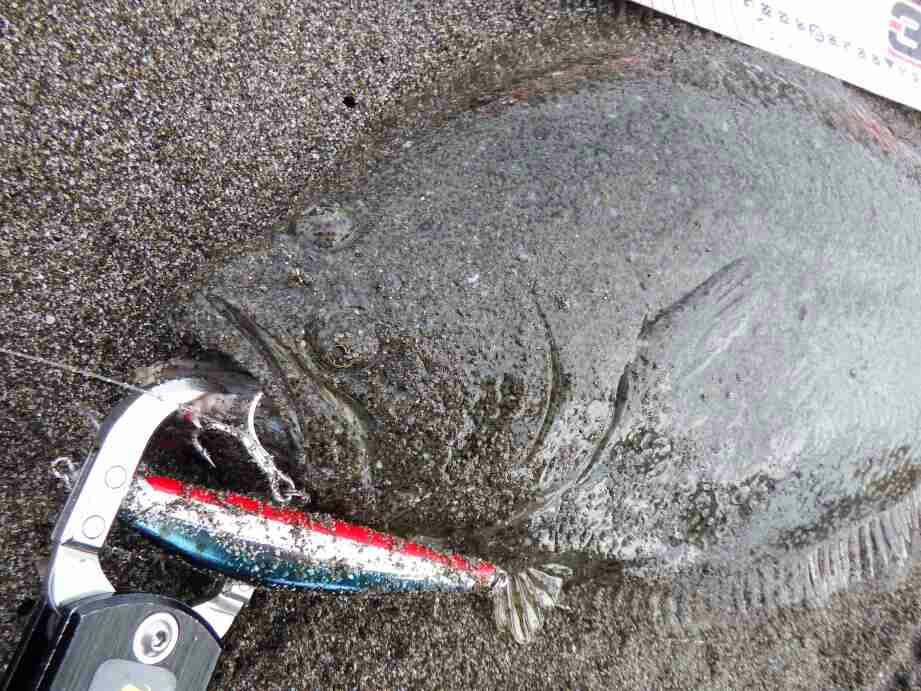 データー:08:20ゲット、ヒラメ体長61cm、ジャクソン アスリート14SS ウルメイワシ