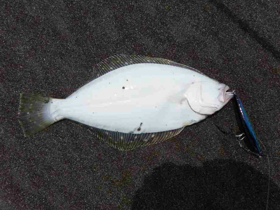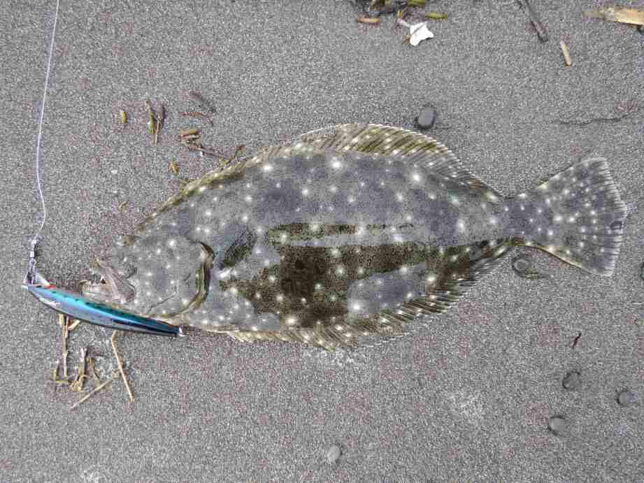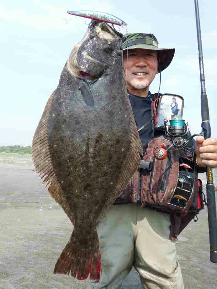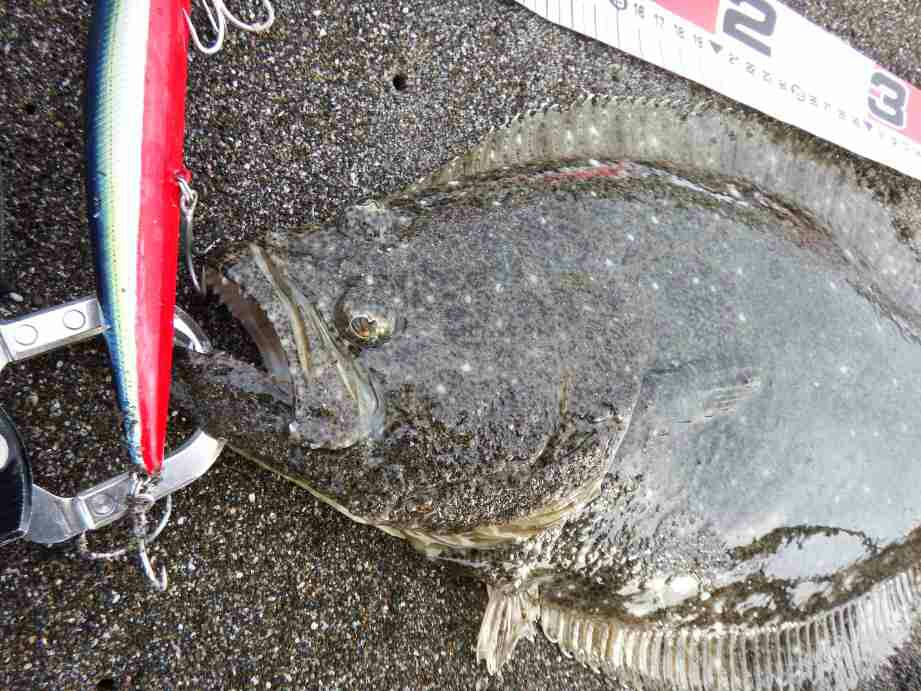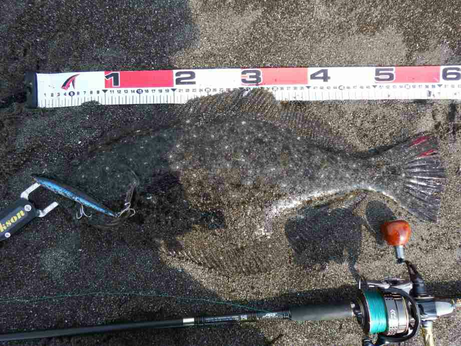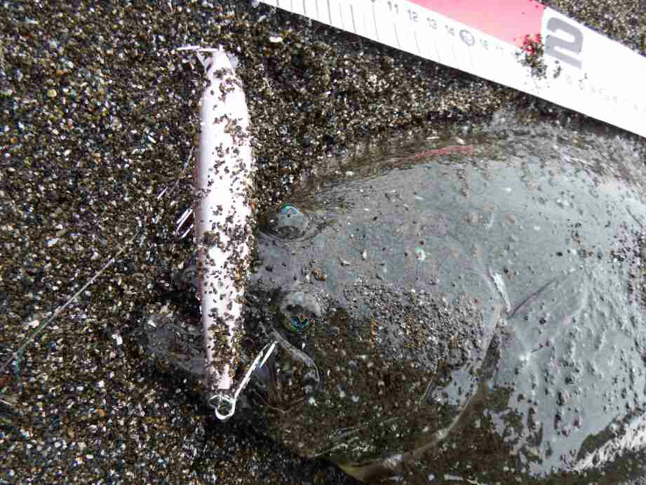 ショートバイトが有り、合わせを入れると動かない「アレ?根掛りか」と思った瞬間動き出し、ブレーク付近での横走りに一瞬シーバスかと思ったが、やはりヒラメだった。