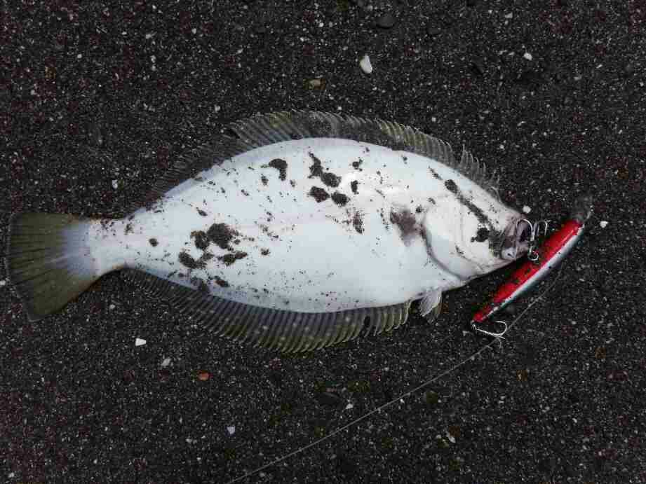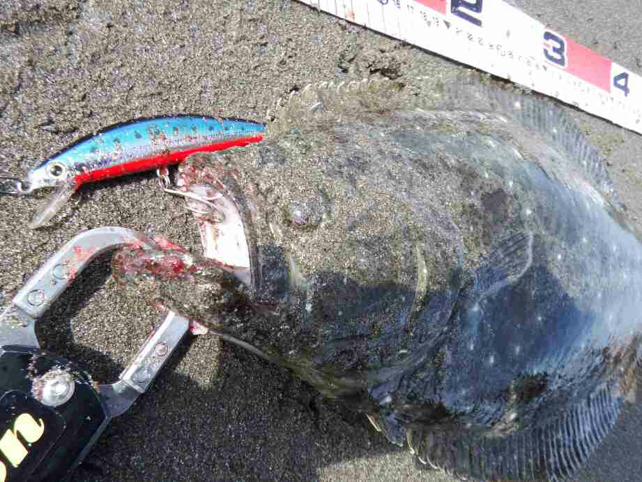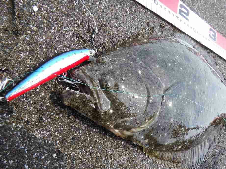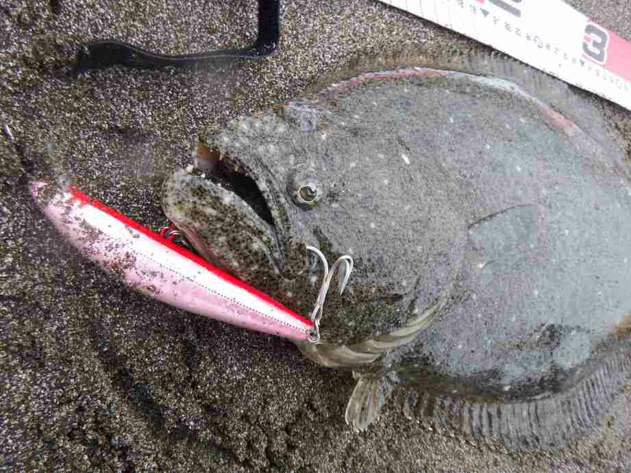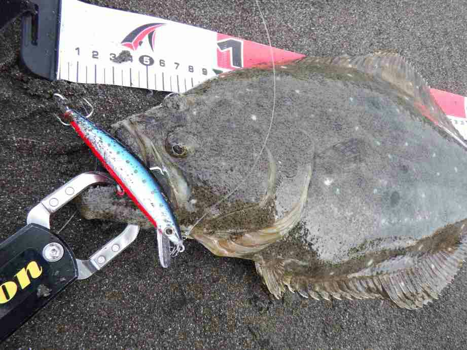 データー:06:20ゲット、ヒラメ体長46cm、シマノ ヒラメミノーⅡ125S マイワシ