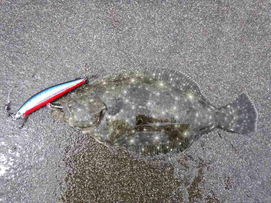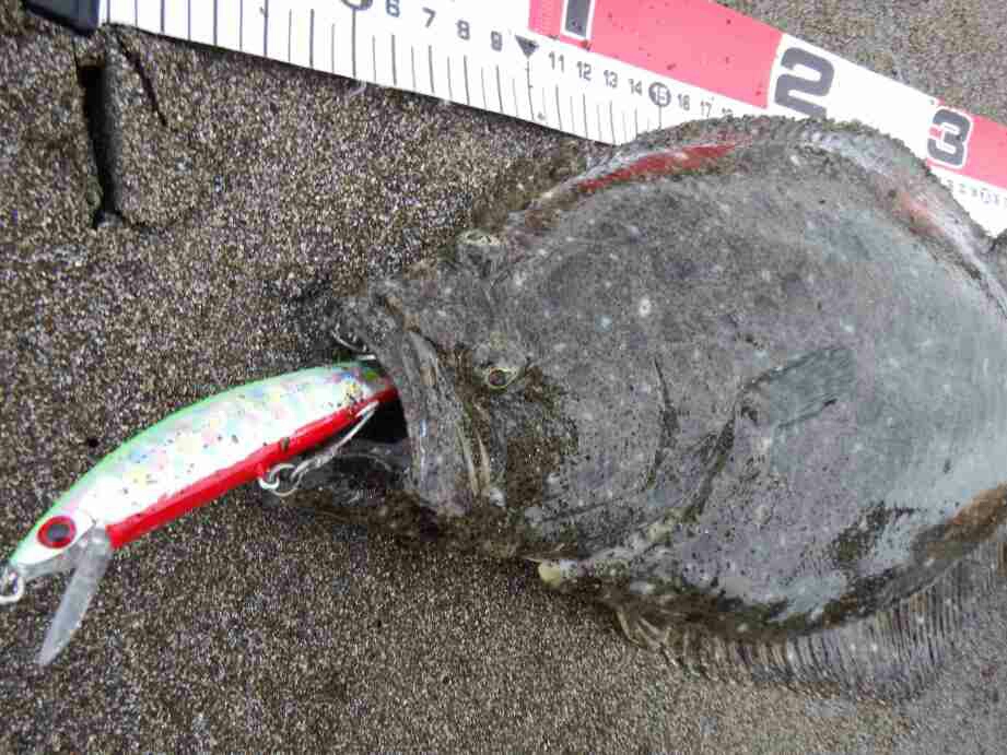 6時頃にはハッキリと海水の透明度も分かり、シマノ ヒラメミノーⅡ125S マイワシにチェンジし、キャストすることおよそ10分、間違いなくヒラメサイズと分かるバイトにほくそ笑み!寄せ波に乗せてヅリ上げる。