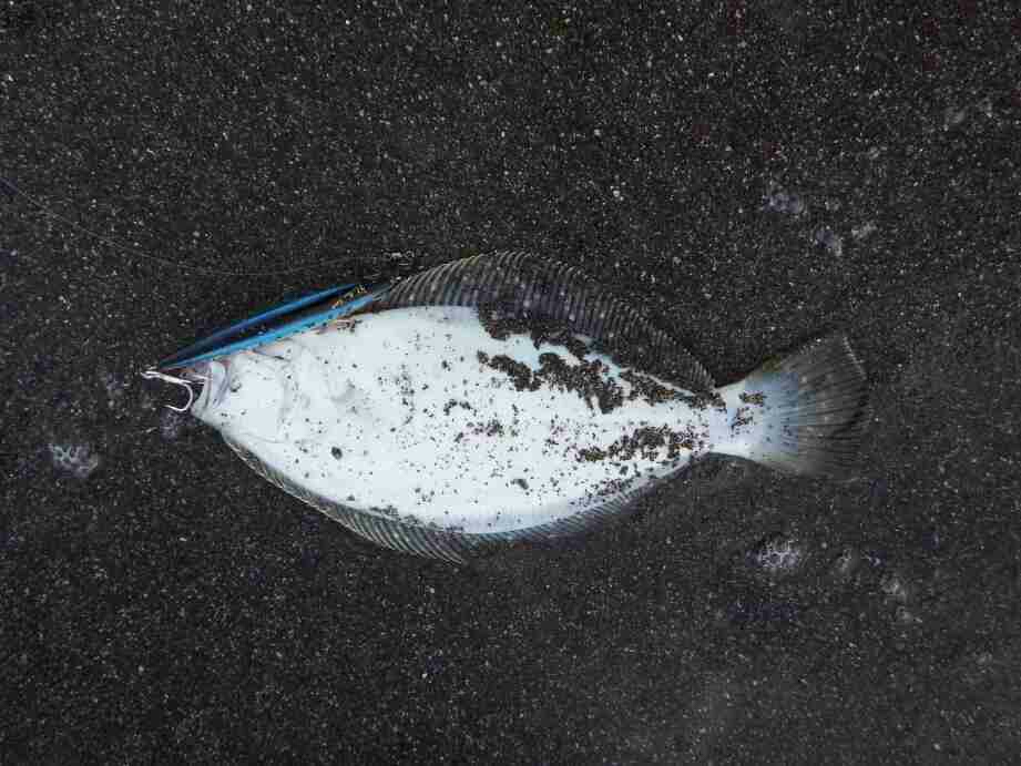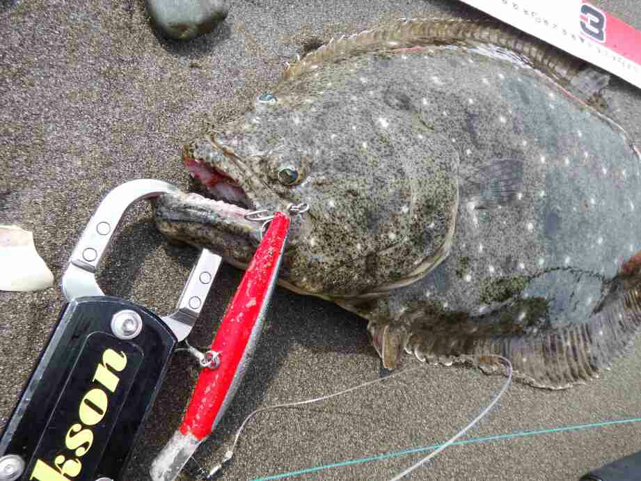データー:10:50ゲット、ヒラメ体長47cm、ジャクソン ピンテールチューン27 アカハライワシ
