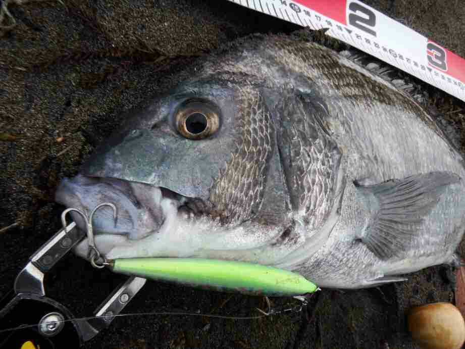 データー:05:10ゲット、黒鯛体長45cm、ジャクソン ビンテールチューン27 レモンキャンディー
