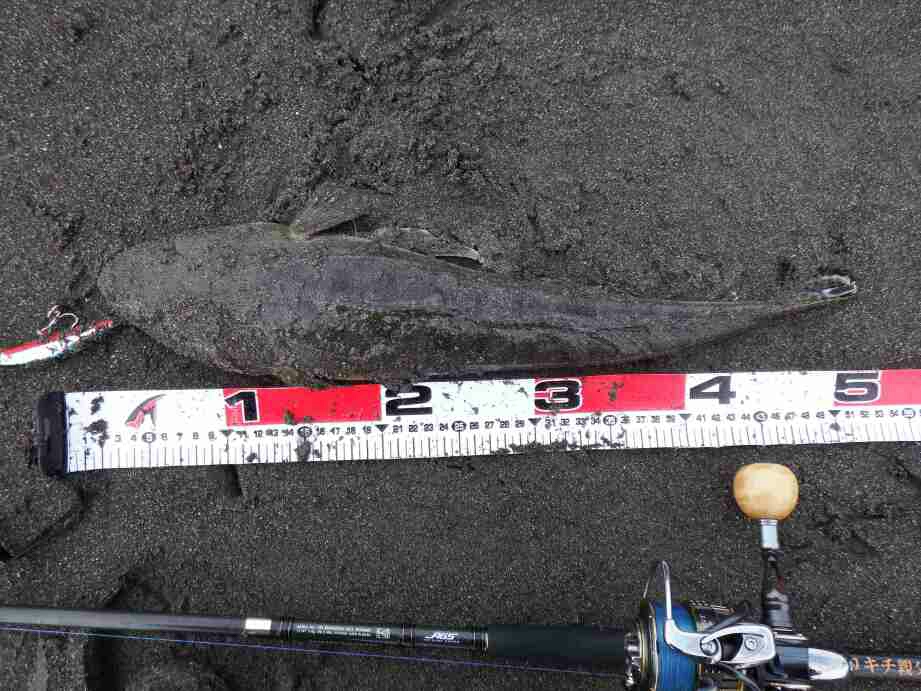 ランガンを続けていると、今度はヒラメサイズと思われるバイトとファイトに心躍ったが、ヅリ上げて見ると40cm弱のソゲでした。